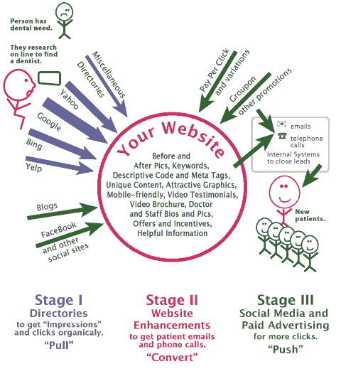 The footwork of “Stage I” will increase your visibility in the local directories and get you impressions and, hopefully, clicks through to your website. Then, once they get to your website, it’s a matter of engaging the potential patient and moving them to make an initial contact by e-mail or phone.